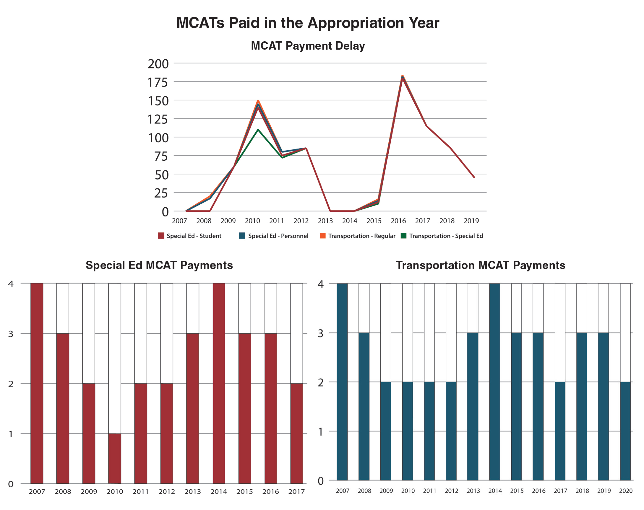 Additionally, often the State has addressed its own cash flow challenges on the backs of school districts by delaying the quarterly remittances for these same less-than-fully-funded programs. Fortunately, with the implementation of Evidence-Based Funding, less funding is distributed through the MCATs, but as we saw during the recession and again during the Rauner administration’s budget stalemates, when the State faces fiscal challenges, there can be significant delays in payment. At the peak of the recession challenges in FY2010, only one of four special education MCATs and two of four transportation MCATs were paid in their proper fiscal year. ISBE had just caught up and made all payments in the proper year in FY2014 when the budget stalemates occurred. At its worst in FY2016, the final June 30 payment for all MCATs was not made until the end of December, nearly six months late.