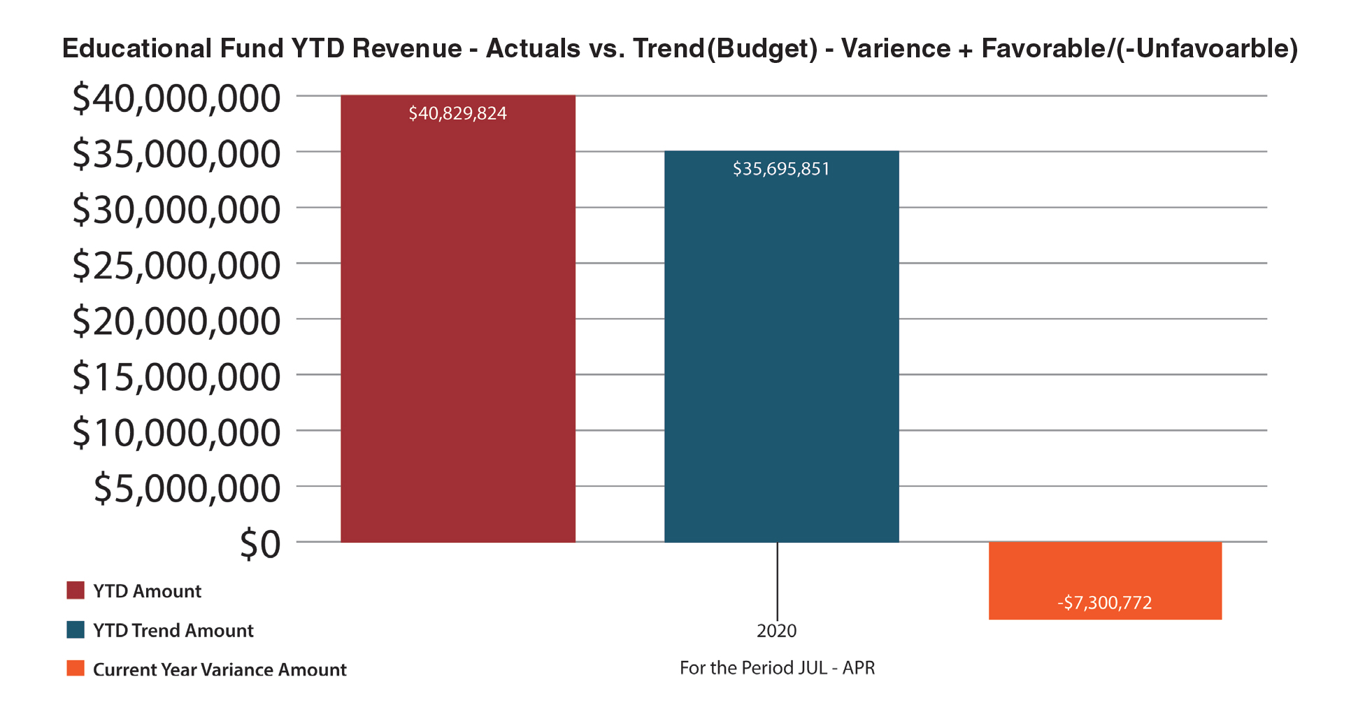 Actuals vs. BudgetsMonthly cash flow reporting shows the district’s progress in implementing the budget by evaluating the current month’s performance (MTD), the year-to-date budget (YTD) with comparisons of what was budgeted versus what actually occurred. It is also important to compare prior years’ actuals to budget and incorporate what is learned from trend analysis to make adjustments as needed to the remainder of the fiscal year.